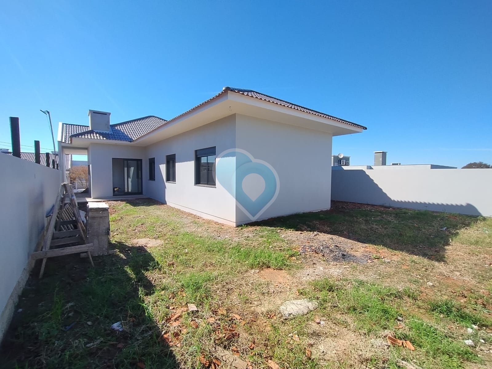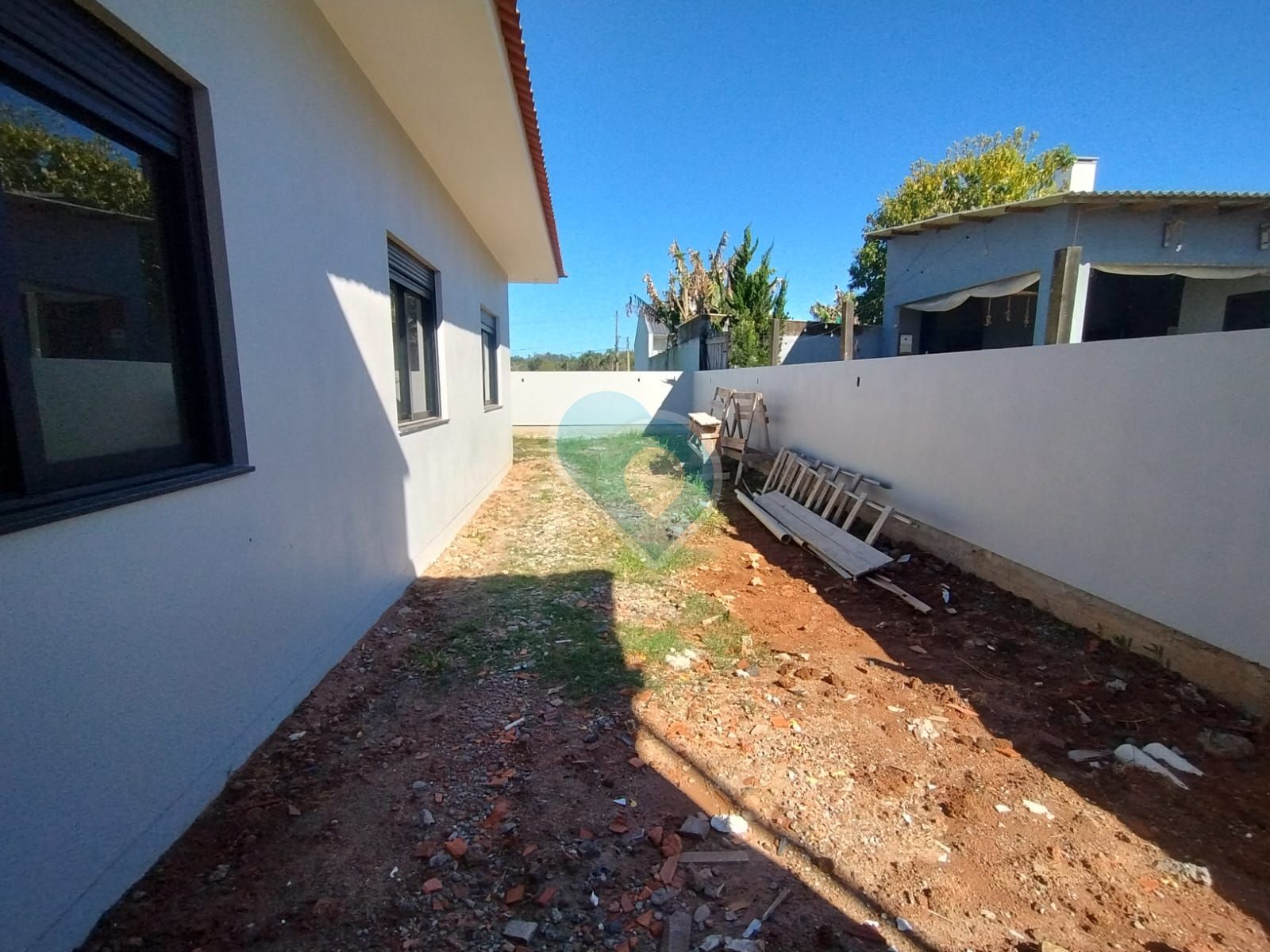 Garagem para 2 automóveis lado a lado e um amplo pátio murado nos fundos.